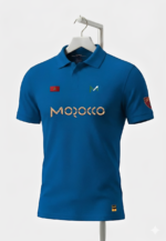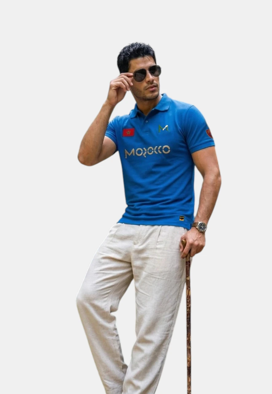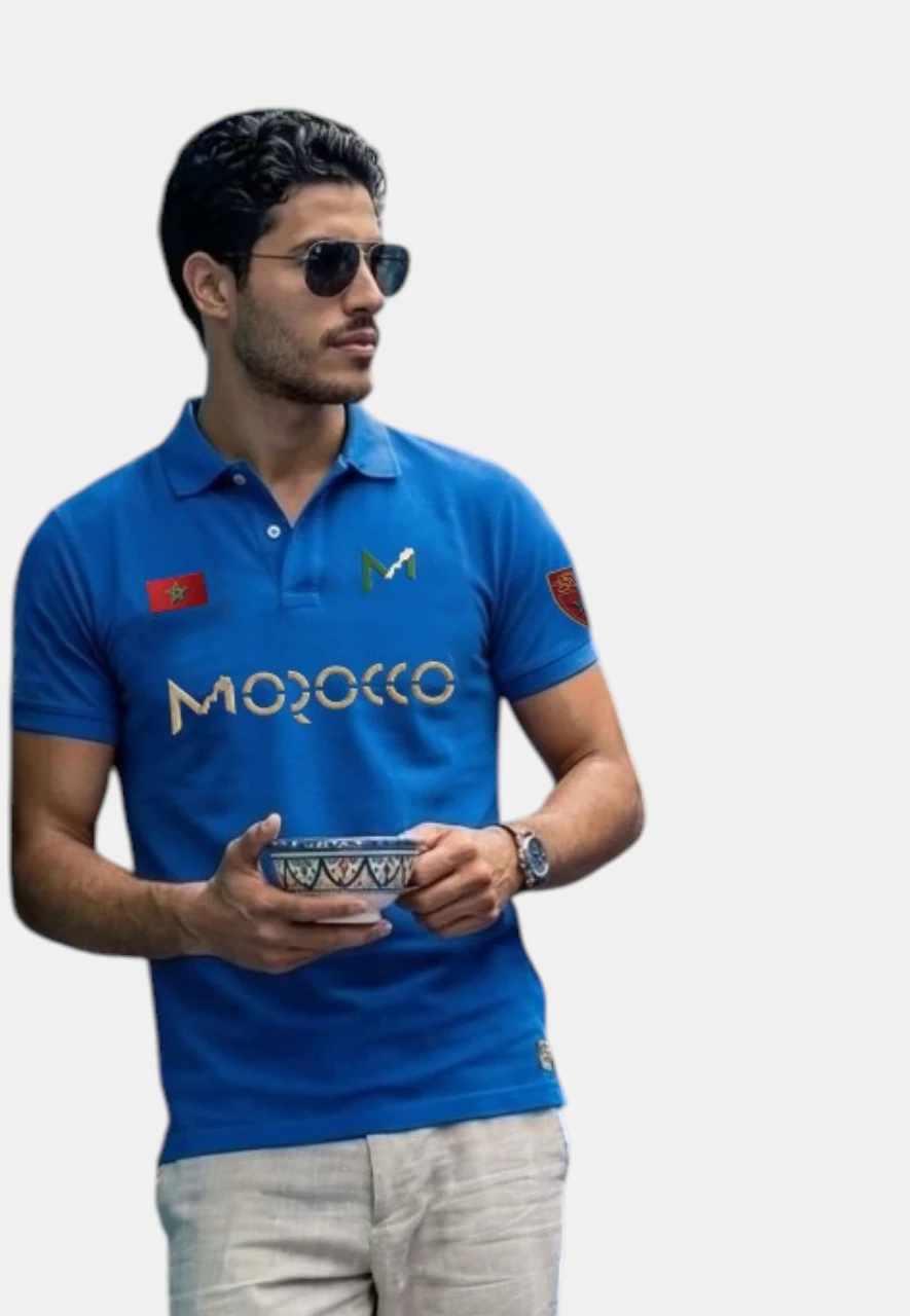 « Affirmez votre identité avec élégance. Découvrez le Polo M bleuAkchour original : maille piquée premium, broderies dorées de la carte du Maroc et drapeau national. L’authenticité du Made in Morocco signée M. »