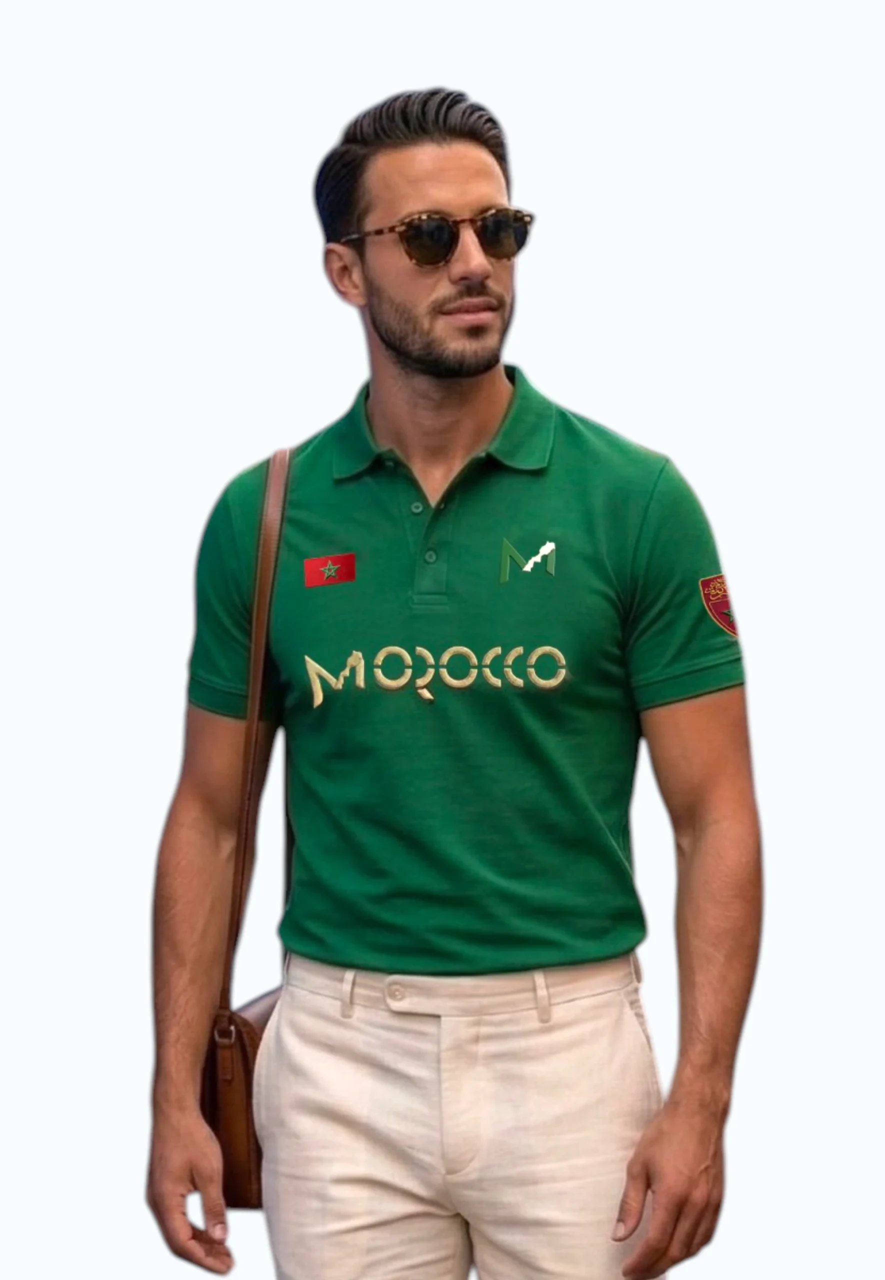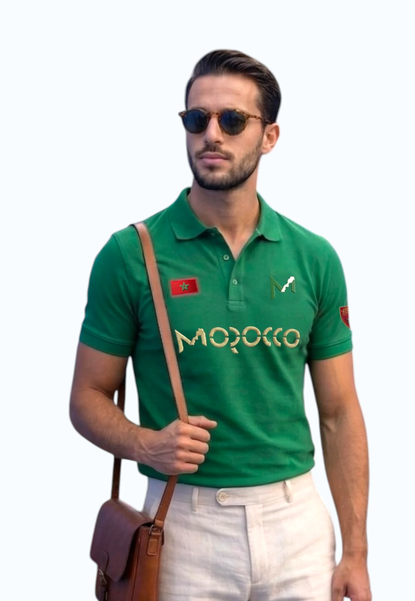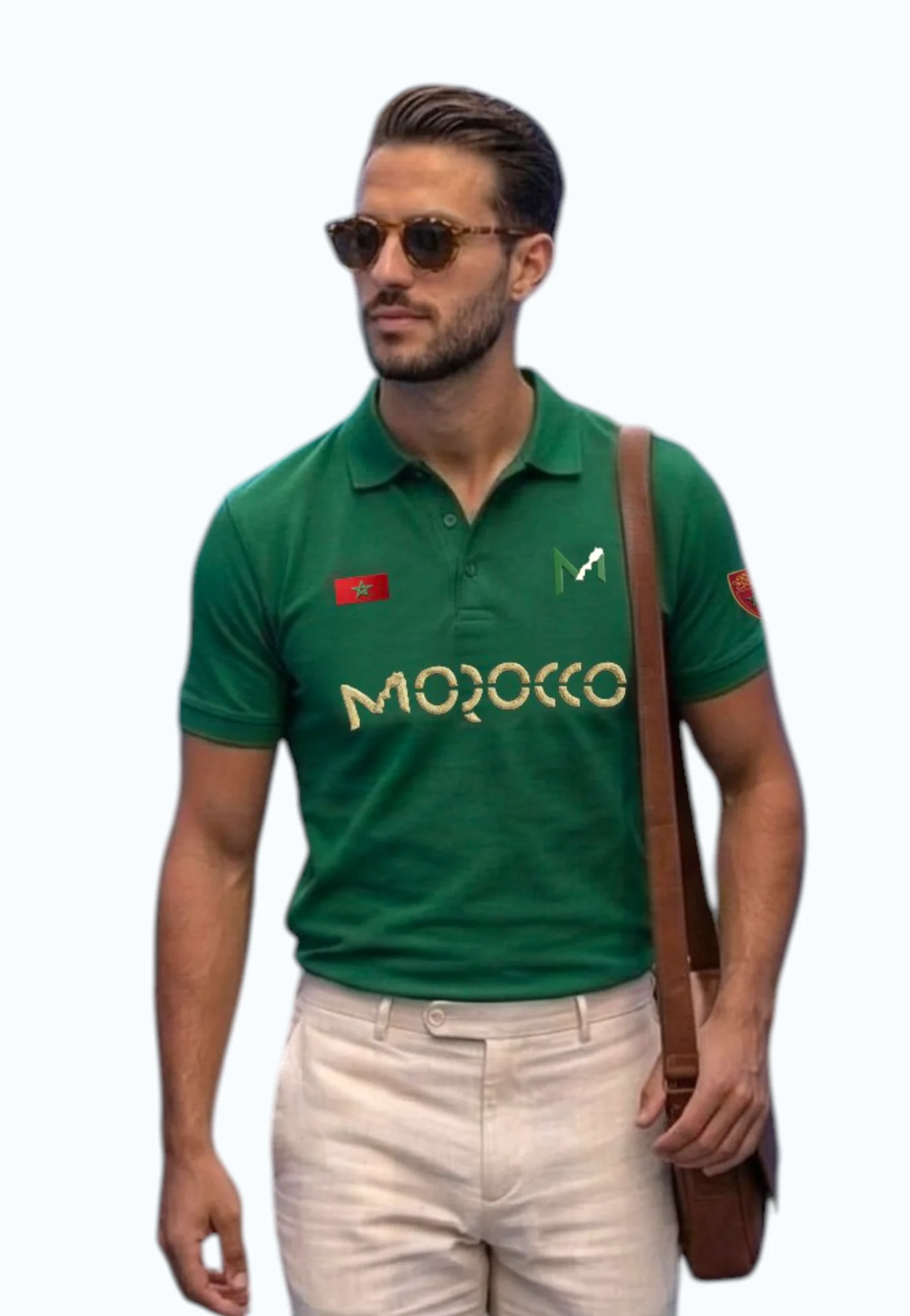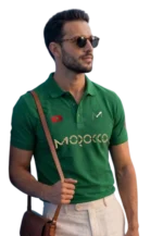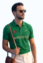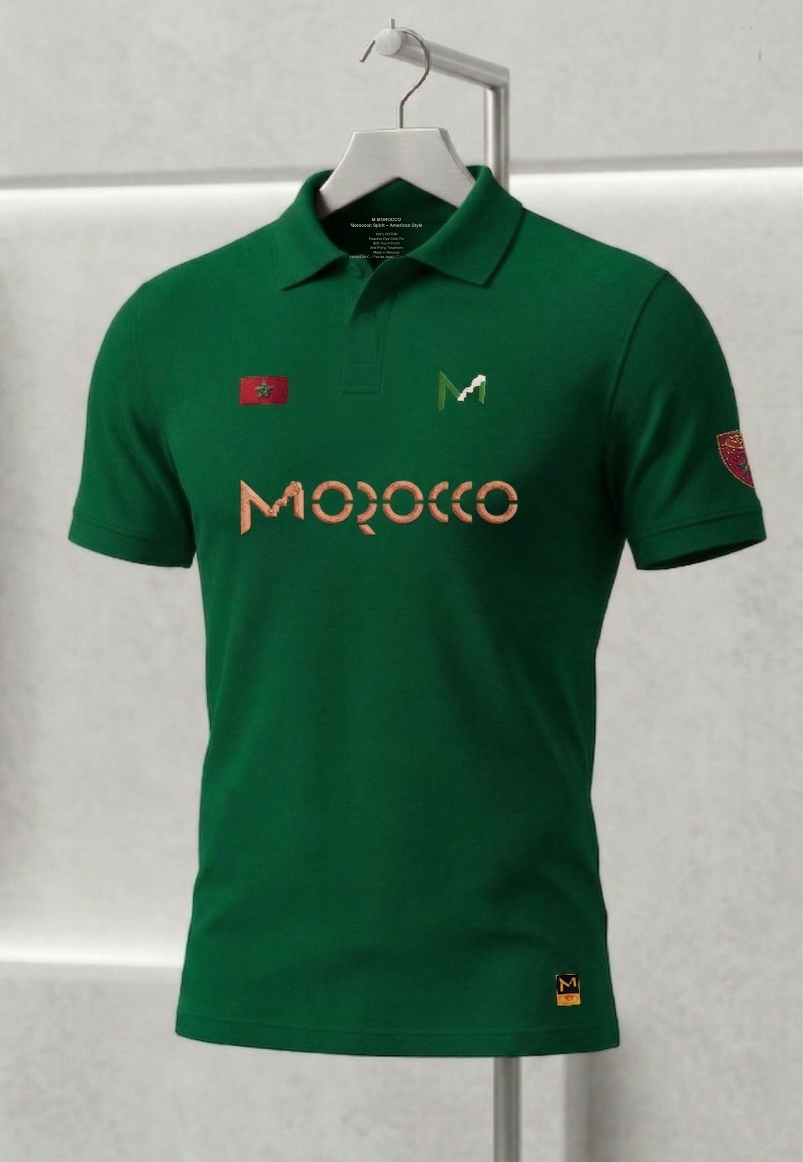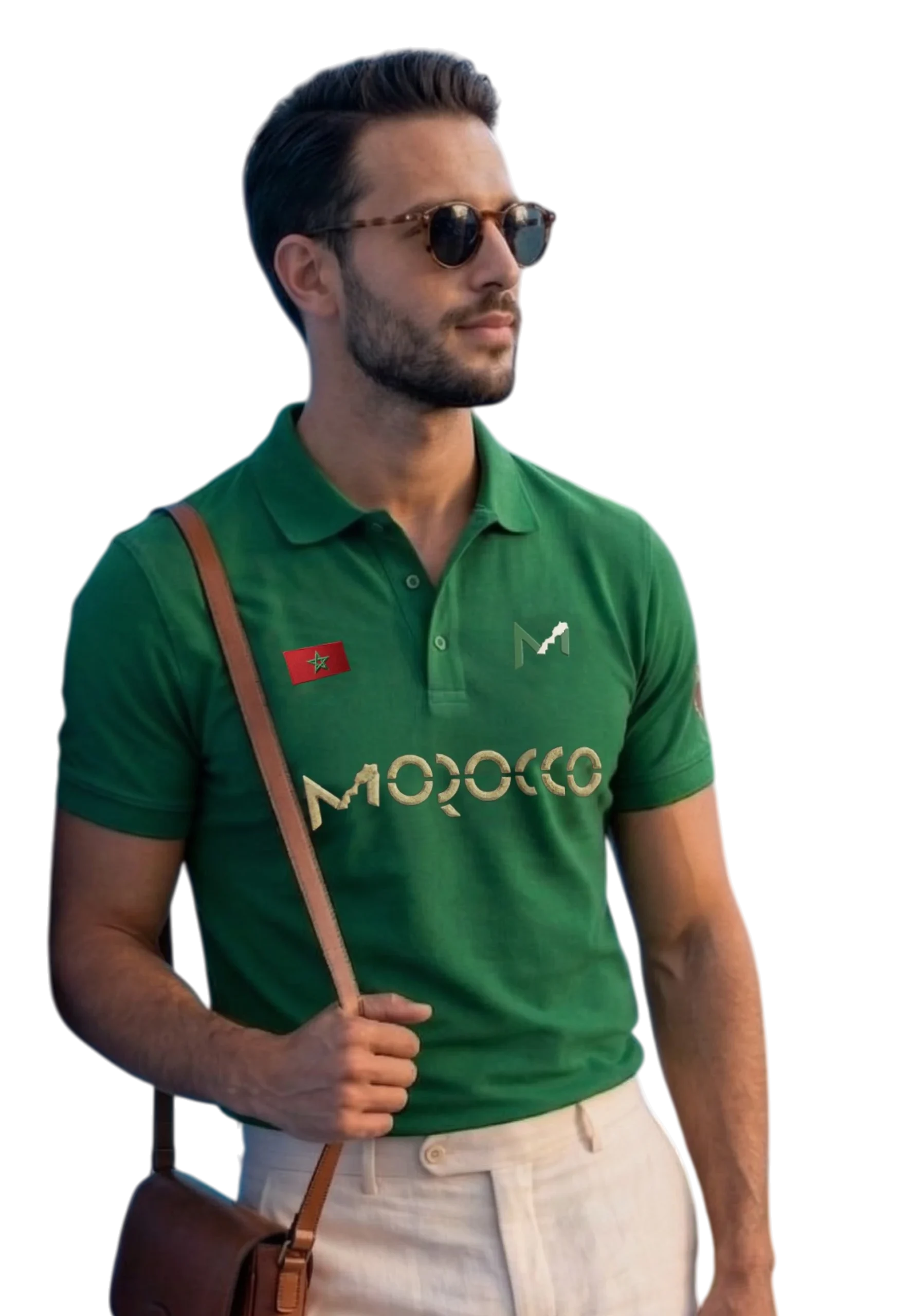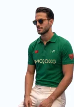 « Affirmez votre identité avec élégance. Découvrez le Polo M vert original : maille piquée premium, broderies dorées de la carte du Maroc et drapeau national. L’authenticité du Made in Morocco signée M. »